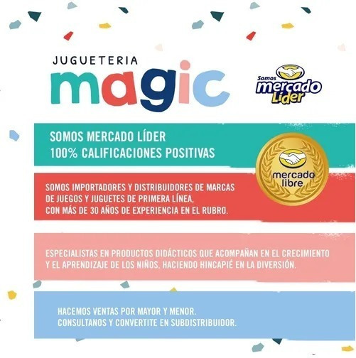 Somos Magic, una empresa familiar dedicada a la comercialización minorista y mayorista de juegos y juguetes desde hace más de 35 años. Contamos con más de cientos de productos nacionales e importados, y una amplia variedad de juegos didácticos, pensados en el sano desarrollo y esparcimiento de los niños, para lograr que se diviertan y aprendan jugando.