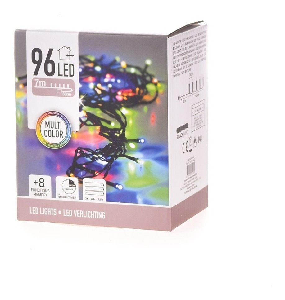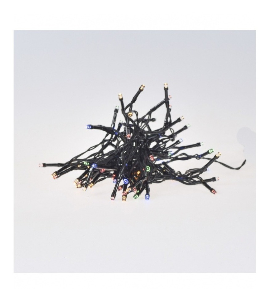 Tira de 96 luces LED multicolor con cable negro, aptas para exteriores. Con timer de 6 horas prendidas y 18 hs apagadas, y control de 8 funciones con memoria. Funciona con 3 pilas AA. Cable negro.