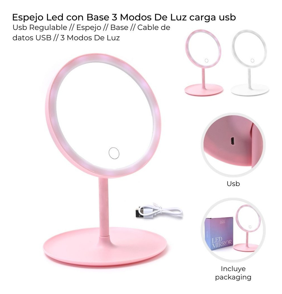 Espejo led con base 3 modo de luz carga usb Skora