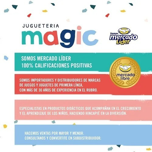 Somos Magic, una empresa familiar dedicada a la comercialización minorista y mayorista de juegos y juguetes desde hace más de 35 años. Contamos con más de cientos de productos nacionales e importados, y una amplia variedad de juegos didácticos, pensados en el sano desarrollo y esparcimiento de los niños, para lograr que se diviertan y aprendan jugando.