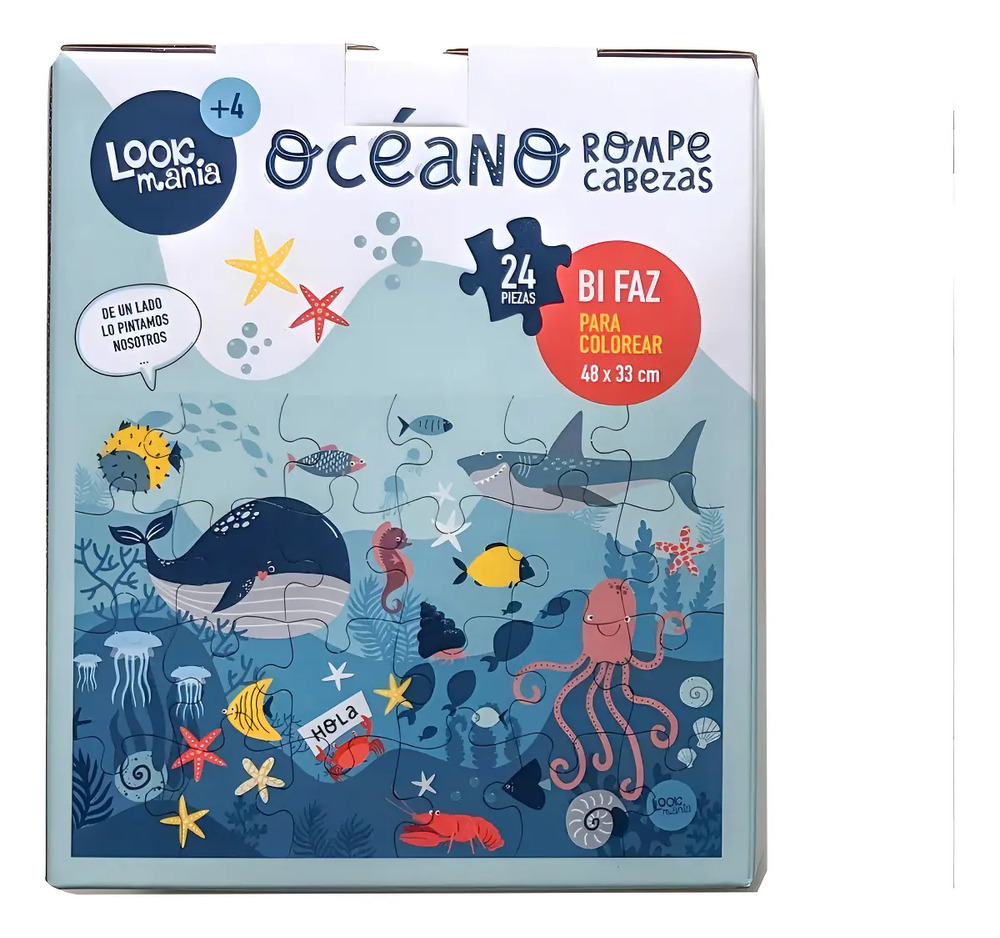 Rompecabezas Bifaz Para Colorear Océano Puzzle Lookmania 24pz’ es un juego de mesa ideal para niñ@s. Este rompecabezas de 24 piezas presenta animales del océano y es bifaz. De un lado, las piezas están a color y del otro, están en blanco para que los niños puedan colorearlas a su gusto. La medida del rompecabezas es de 48 x 33 cm y las piezas están hechas de cartón grueso. Este juego es recomendado para niños de 3 años en adelante. Los rompecabezas como este ayudan a estimular el pensamiento lógico, la orientación espacial, la relajación y la motricidad fina de los niños.